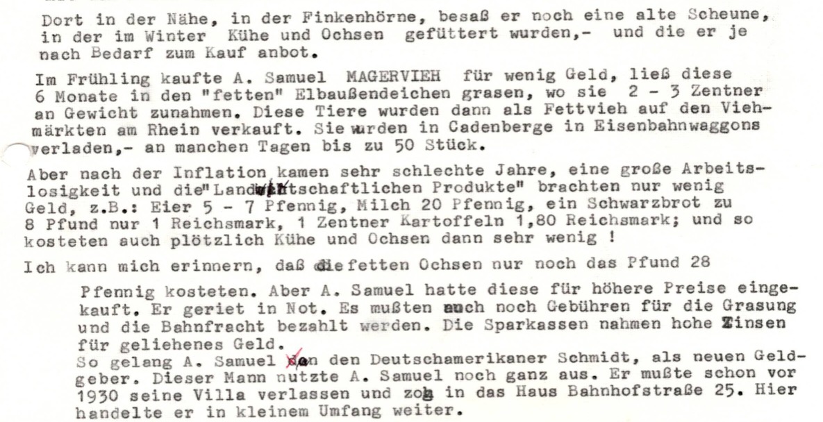 A significant document dated February 19,1988 by Mrs. von Ahn-Schlichting of Cadenberge, made available to us by the local historian G. Lunden in the summer of 2025, helps in clarifying the background to the sale of the house. In it, the contemporary witness describes many details about the living and working conditions of the cattle dealer during the inflationary years 1922/23.